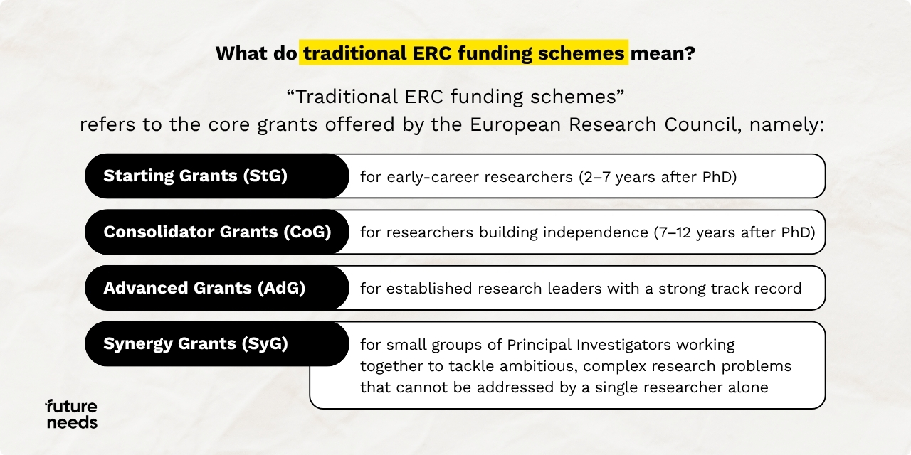 “Traditional ERC funding schemes” refers to the core grants offered by the European Research Council, namely: